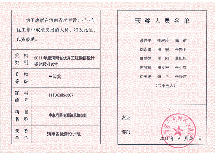 中牟縣雁鳴湖鎮(zhèn)總體規(guī)劃獲獎(jiǎng)證書-2010.2011-公司榮譽(yù)