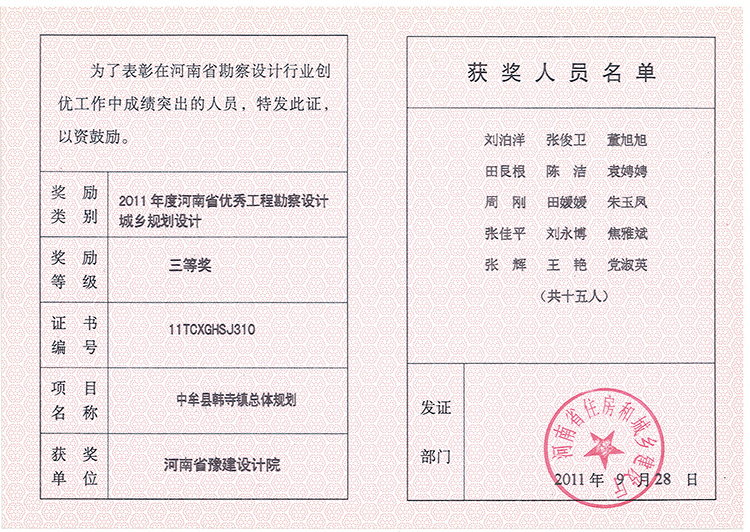 中牟縣韓寺鎮(zhèn)總體規(guī)劃獲獎證書-2010.2011-公司榮譽