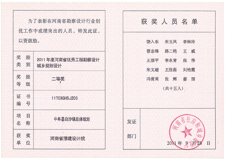 中牟縣白沙鎮(zhèn)總體規(guī)劃獲獎(jiǎng)證書(shū)-2010.2011-公司榮譽(yù)