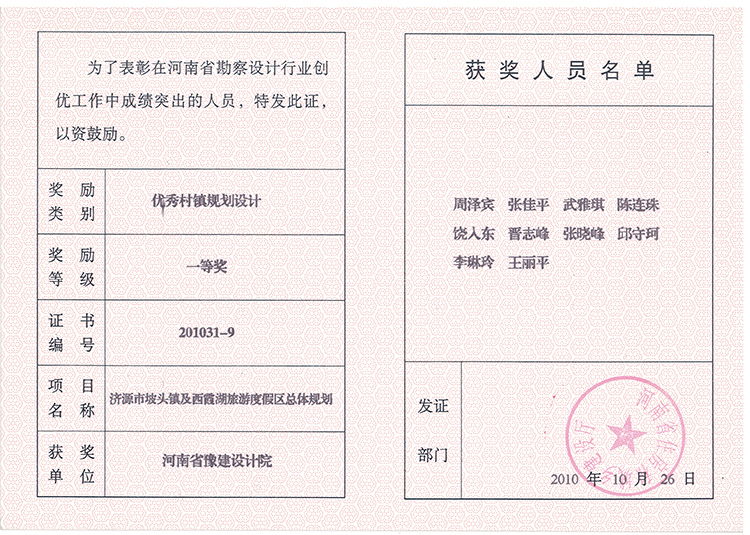 濟(jì)源市坡頭鎮(zhèn)及西霞湖旅游度假區(qū)總體規(guī)劃獲獎證書-2010.2011-公司榮譽(yù)