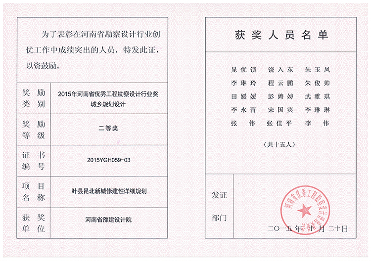 葉縣昆北新城修建性詳細(xì)規(guī)劃獲獎(jiǎng)證書-2015年獲獎(jiǎng)證書-公司榮譽(yù)