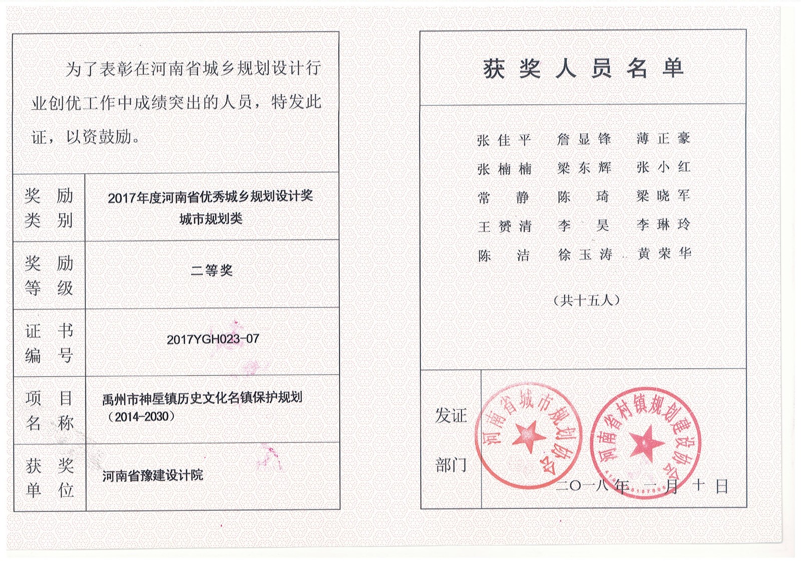 禹州市神垕鎮(zhèn)歷史名鎮(zhèn)保護(hù)獲獎(jiǎng)證書(shū)-2017年獲獎(jiǎng)證書(shū)-公司榮譽(yù)