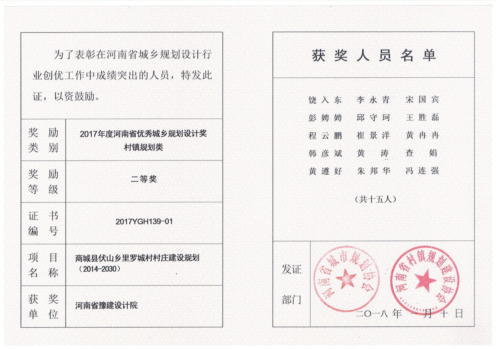 2015年獲獎(jiǎng)證書(shū)