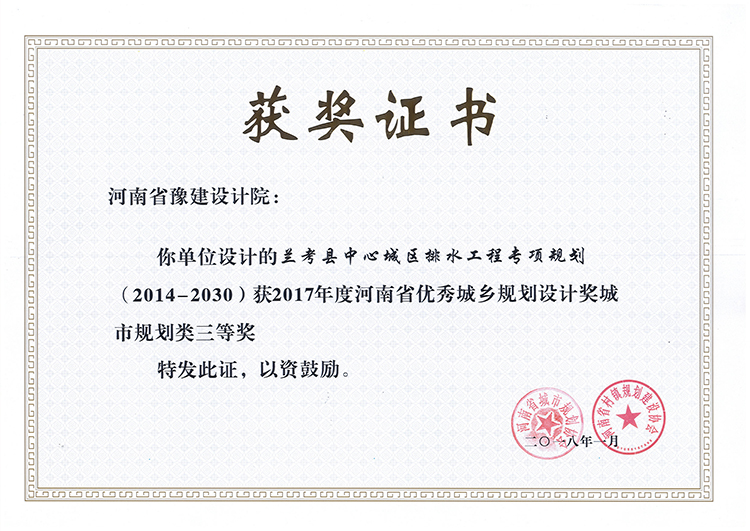 蘭考中心城區(qū)排水工程專項(xiàng)獲獎(jiǎng)證書(shū)