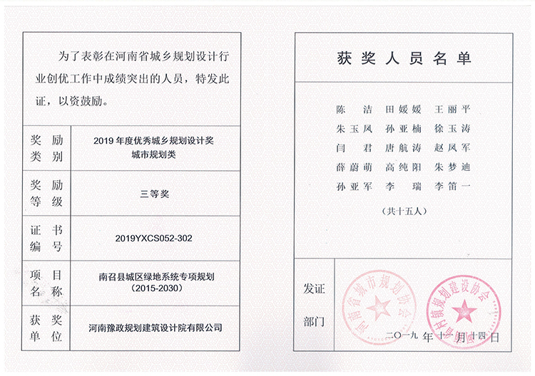 南召縣綠地系統(tǒng)專項規(guī)劃獲獎證書-2019年獲獎證書-公司榮譽
